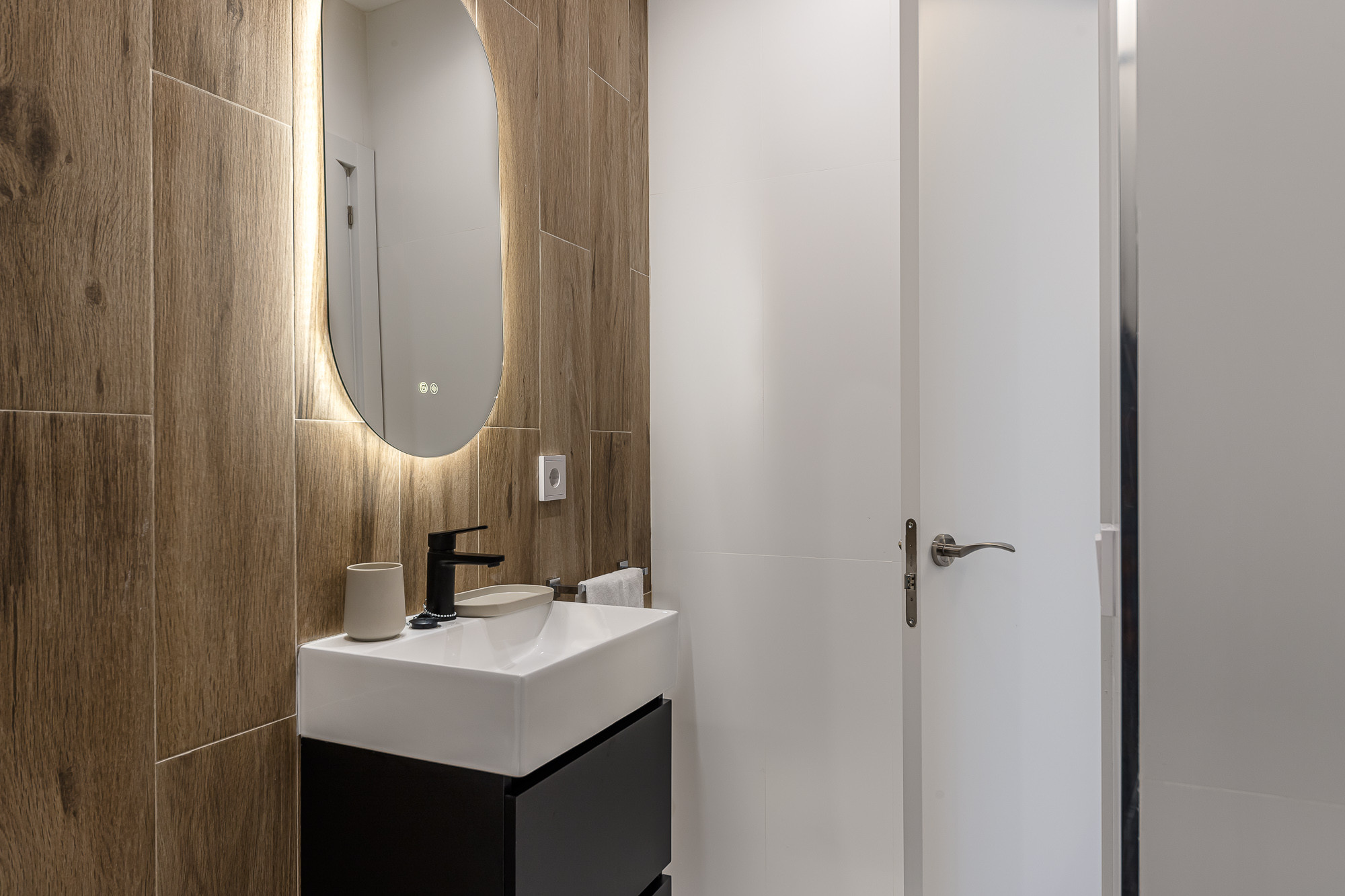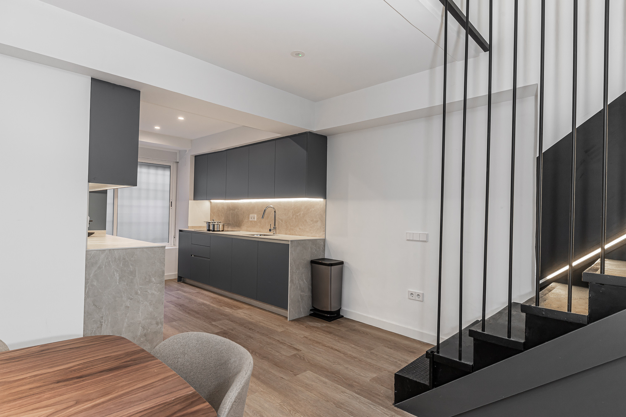 El edificio ofrece una cocina compartida totalmente equipada, un área de estar y una atmósfera tranquila — ideal para estancias cortas, viajes de negocios o alojamiento temporal en Madrid.