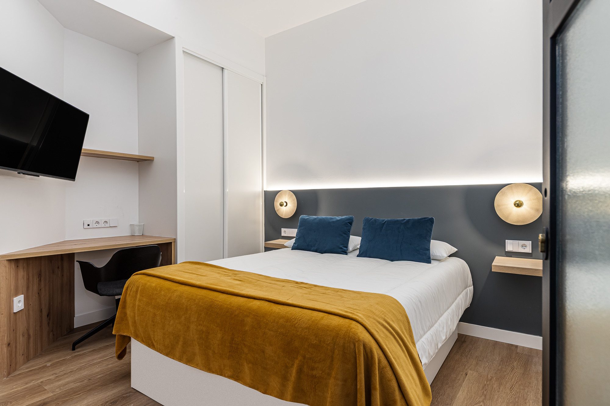 Habitaciones dobles privadas en un espacio de coliving boutique ubicado a solo 100 metros de la Plaza de Olavide, en el corazón de Madrid (Chamberí). Cada habitación cuenta con baño privado, cama doble, Smart TV, mini nevera, máquina de café Nespresso, escritorio, armario espacioso y WiFi de alta velocidad.