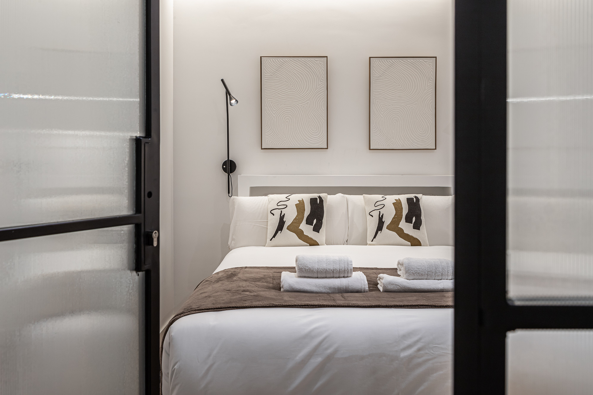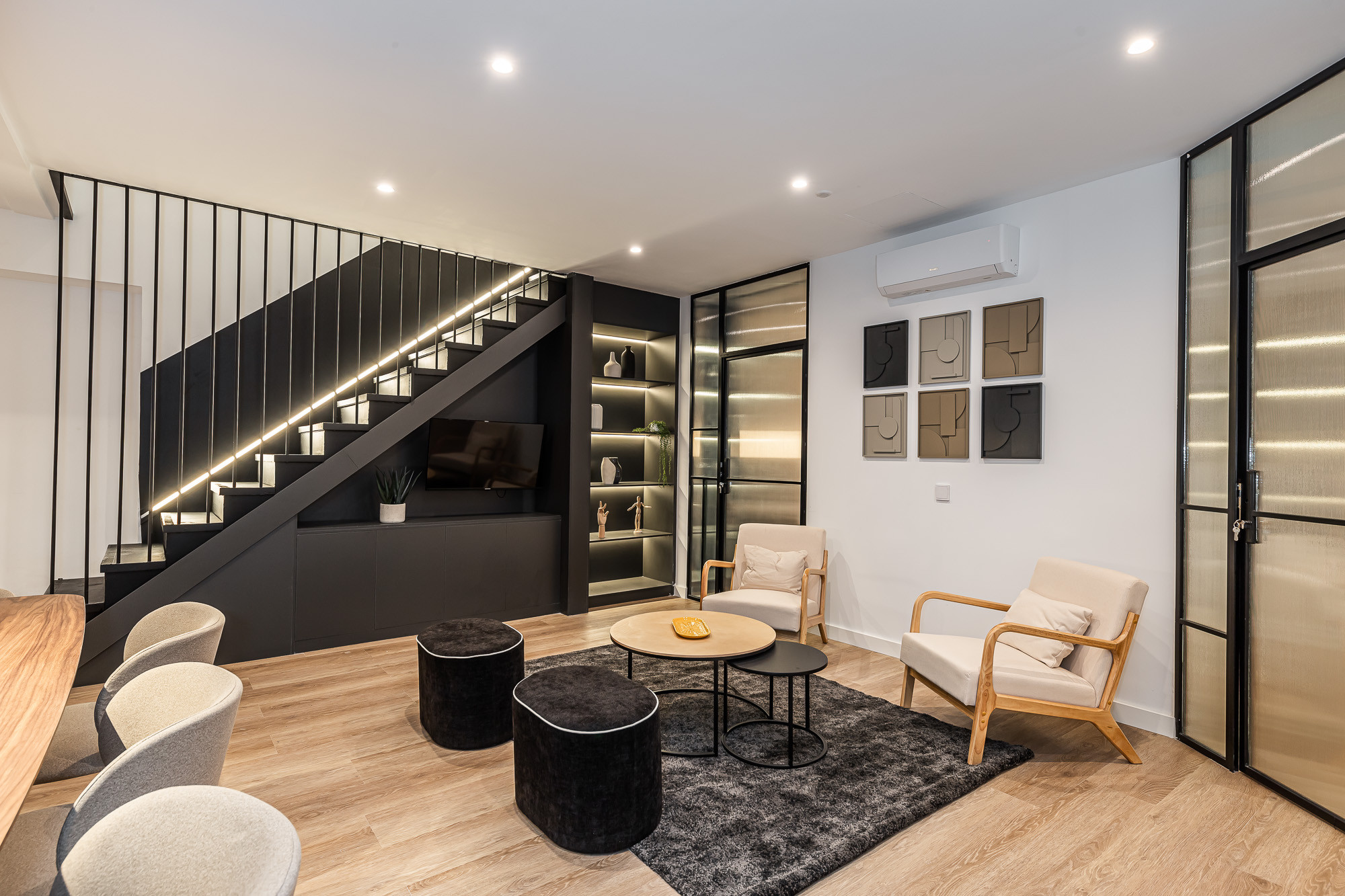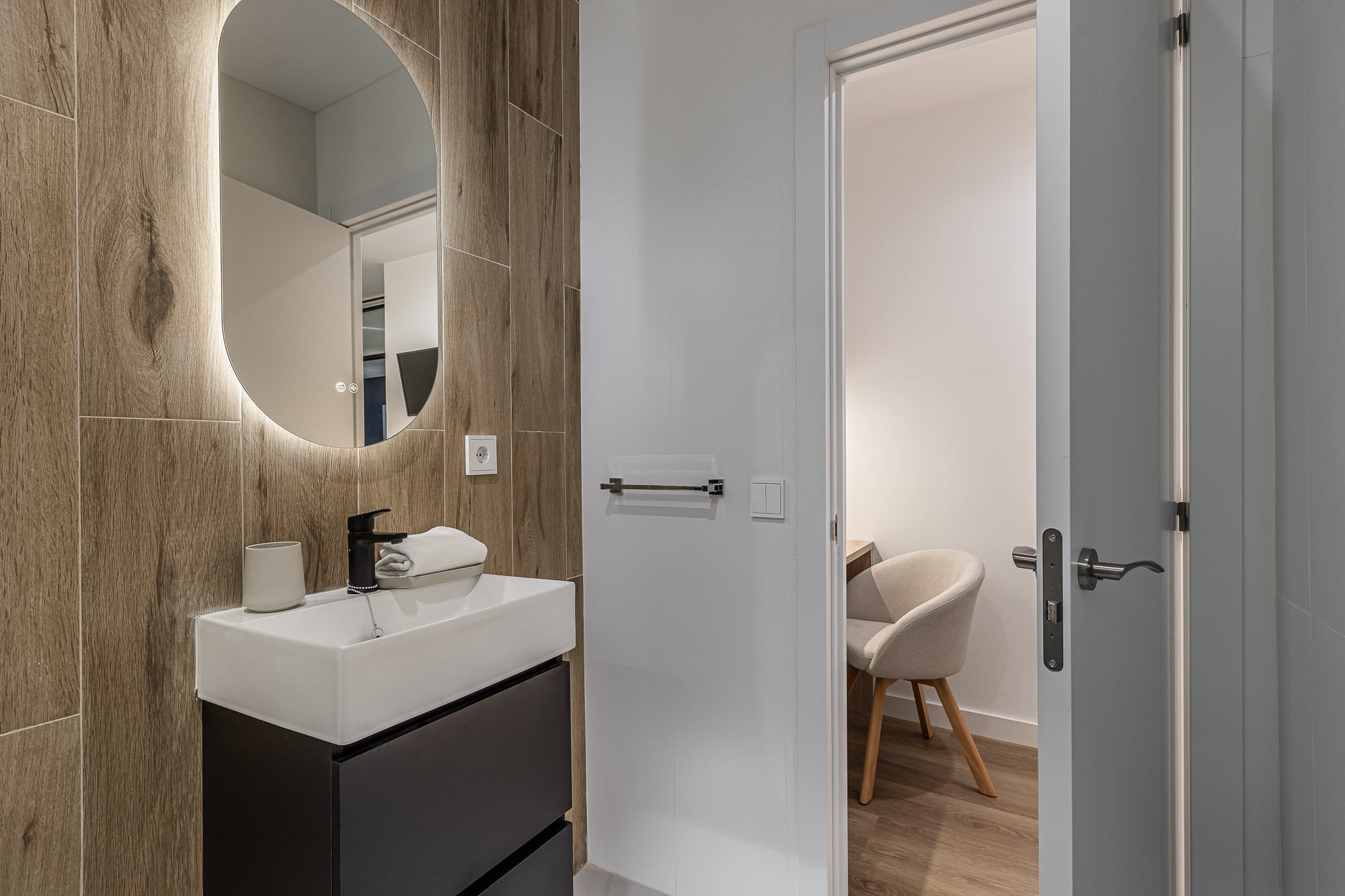 Private double rooms in a boutique coliving space located just 100 metres from Plaza de Olavide, in the heart of Madrid (Chamberí). Each room features a private bathroom, double bed, Smart TV, mini fridge, Nespresso coffee machine, desk, spacious wardrobe and high-speed WiFi.